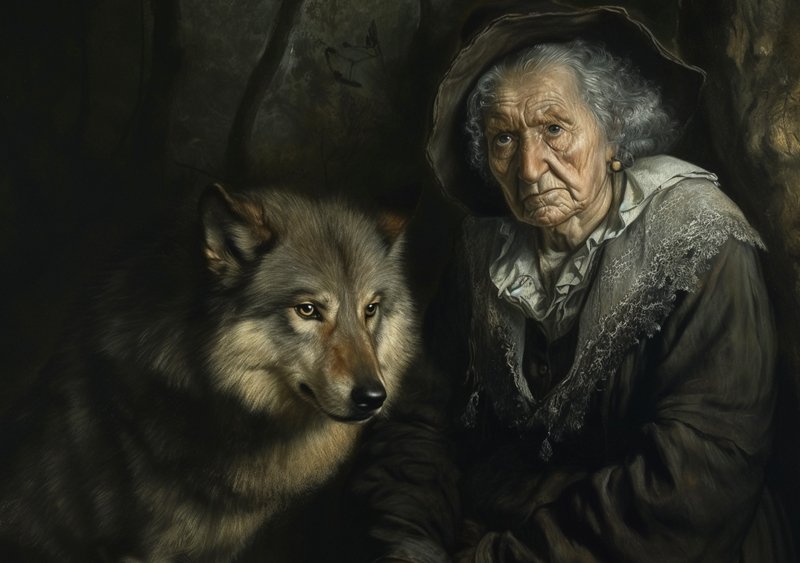 Avec une délicatesse infinie, la vieille femme libéra la bête du piège et, la portant dans ses bras, la ramena à sa chaumière pour la soigner. Pendant plusieurs jours, elle veilla sur l'animal, lui prodiguant des soins et des attentions sans relâche. Mais malgré tous ses efforts, la louve succomba à ses blessures, expirant dans ses bras. Le cœur lourd, la vieille femme, accompagnée du grand loup gris, enterra la louve à l'ombre d’un majestueux chêne.